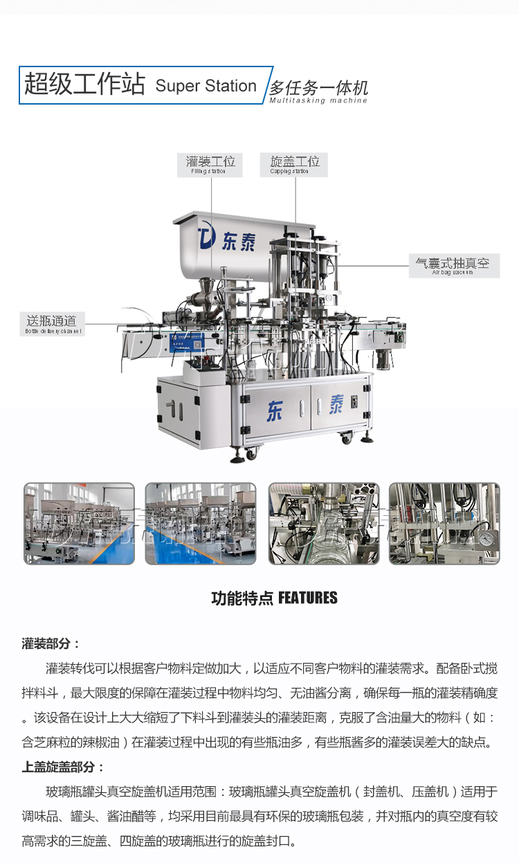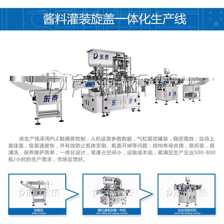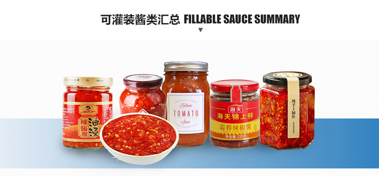 如果是瓶裝的話,可以建議使用我們的辣椒醬灌裝旋蓋一體機。在一臺機械上實現(xiàn)上蓋灌裝抽真空旋蓋等動作。該設備可以通過大顆粒醬料,攪拌均勻,具有灌裝精密,運行穩(wěn)定可靠、工作效率高、壽命長、維護間單等特點。廣泛適用于各種含顆粒的半流體、膏體、醬料的灌裝,也可灌裝各種粘稠體等,價格方面也非常合適。