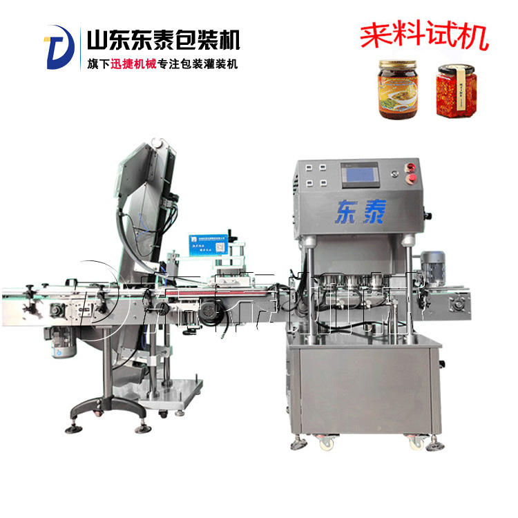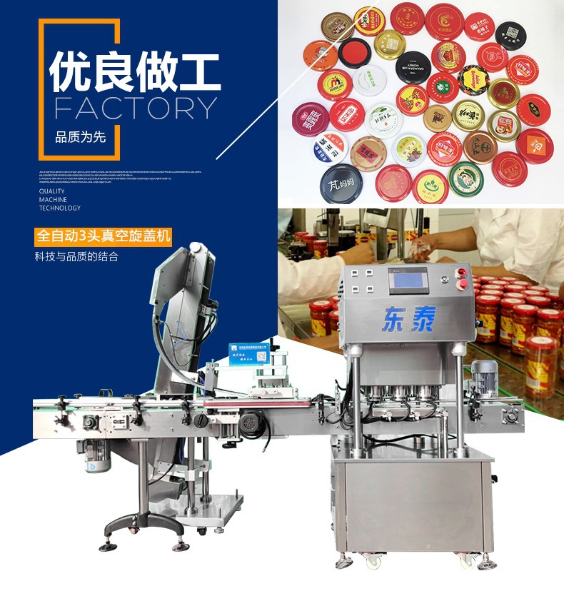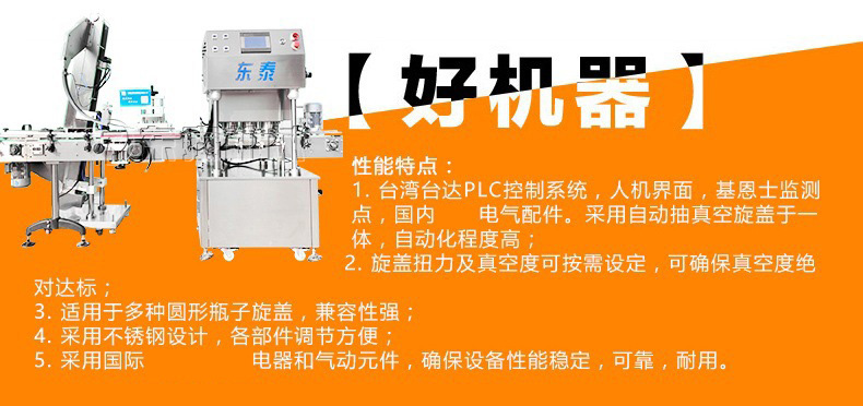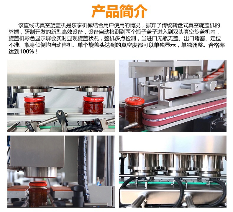 該直線式真空旋蓋機是東泰機械結(jié)合用戶使用情況,摒棄了傳統(tǒng)轉(zhuǎn)盤式真空旋蓋機的弊端,研制開發(fā)的新型高效設(shè)備,設(shè)備自動檢測到兩個瓶子蓋子進入到雙頭真空旋蓋機內(nèi),旋蓋機彩色顯示屏?xí)崟r顯示旋蓋狀況,整機多點檢測,當進口無瓶無蓋、出口堵塞、定位不準、瓶身傾倒均自動停機。單個旋蓋頭達到的真空度都可以單獨顯示,單獨調(diào)整。合格