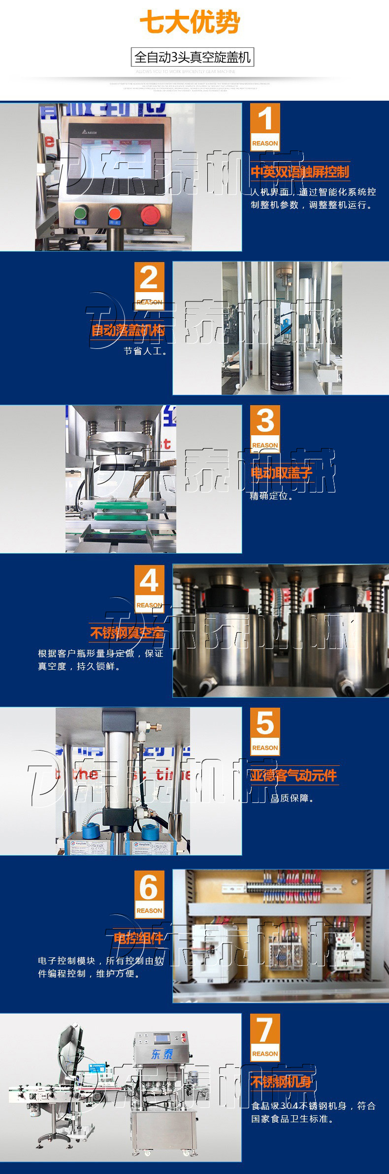 1.臺灣臺達PLC控制系統(tǒng),人機界面,基恩士檢測點,國內(nèi)電氣配件。采用自動抽真空旋蓋于一體,自動化程度高;
