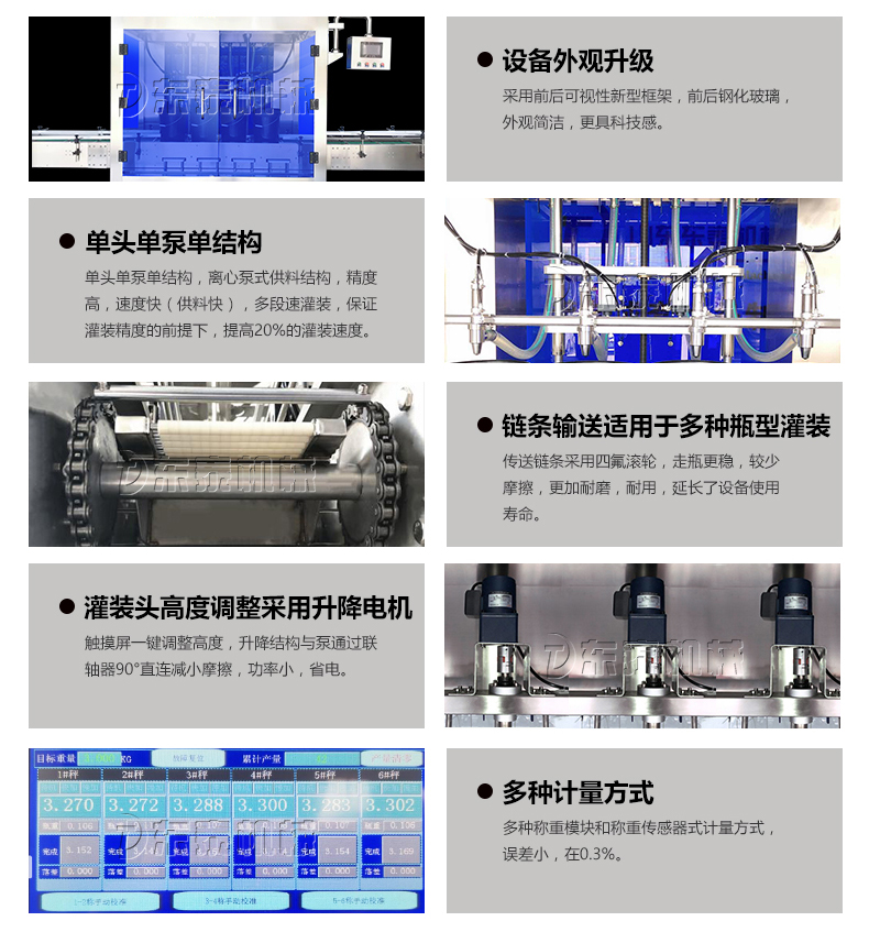 8、每個灌裝頭均有稱重和反饋系統(tǒng),可對每個頭的灌裝量進行設(shè)置和微量調(diào)整。