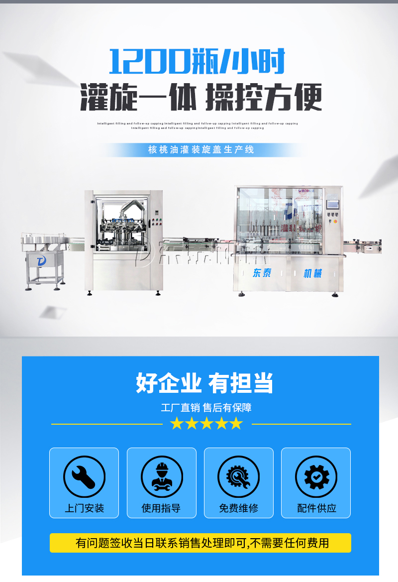 1、本橄欖油灌裝旋蓋機生產(chǎn)線采用機械手旋蓋,配備自動打滑裝置,防止瓶蓋損傷。